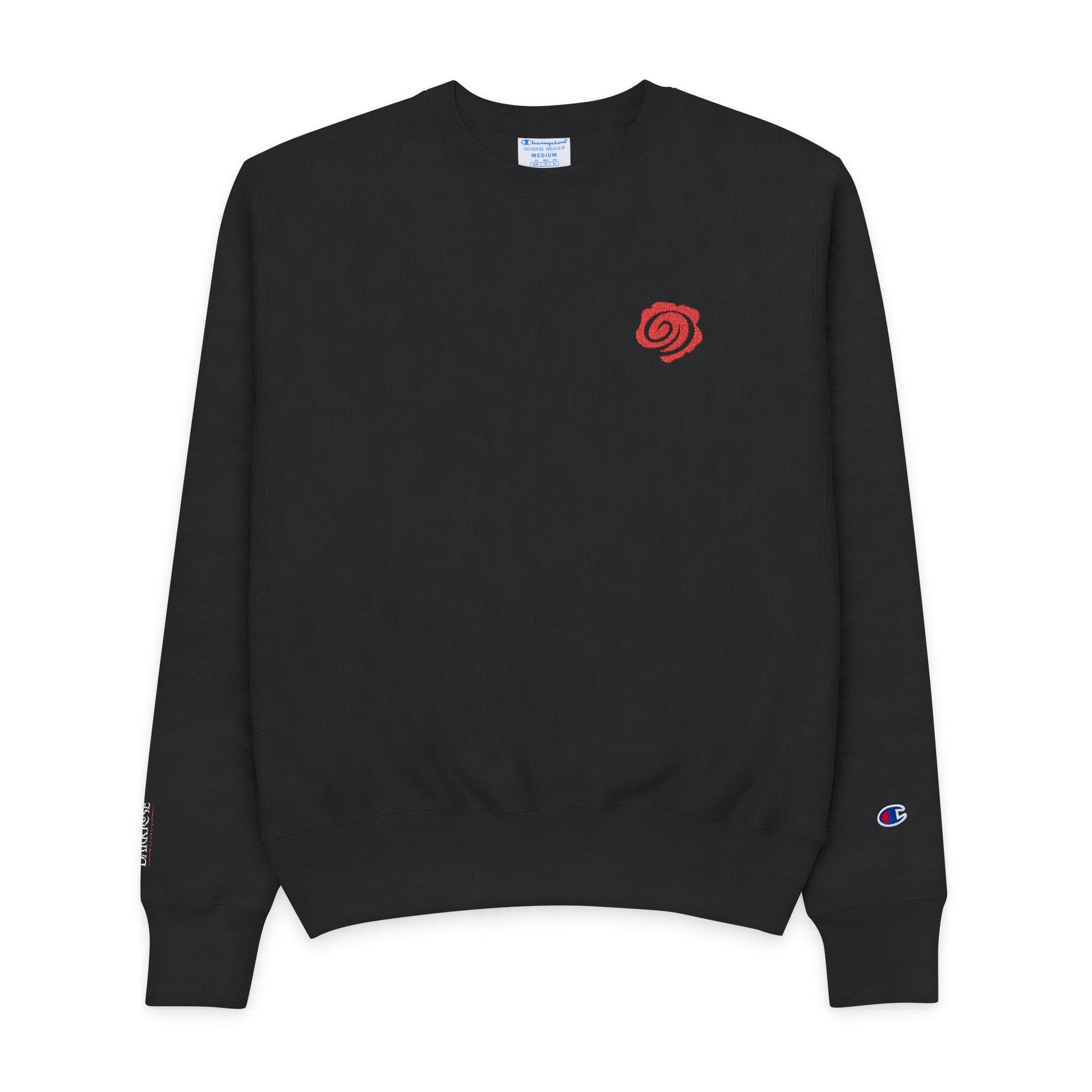 - Embroidered Champion “C” on sleeve and small red rose chest motif for subtle style