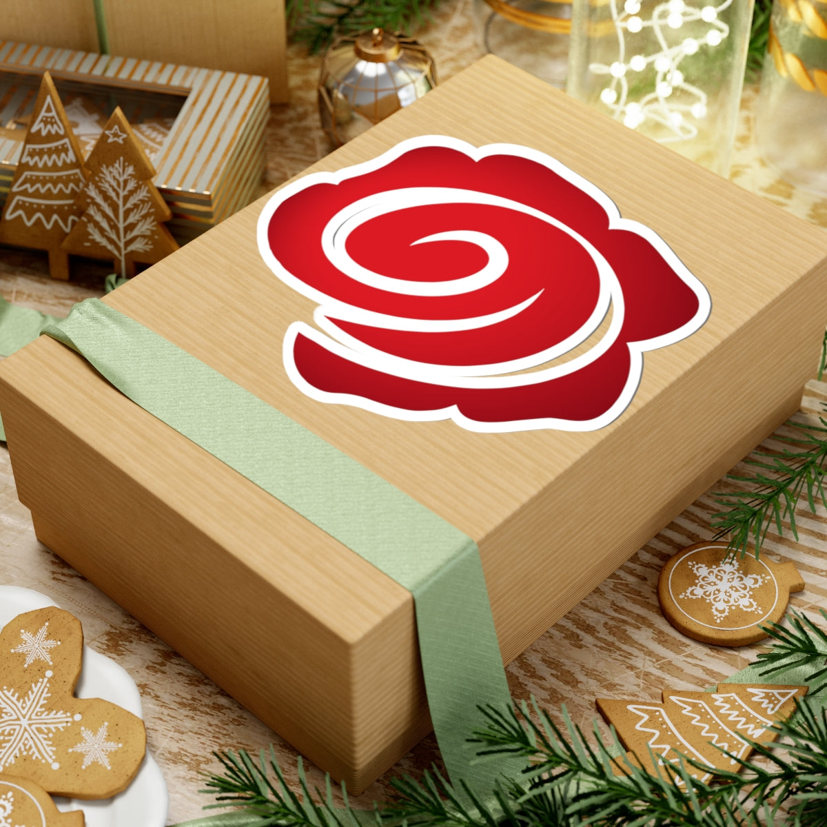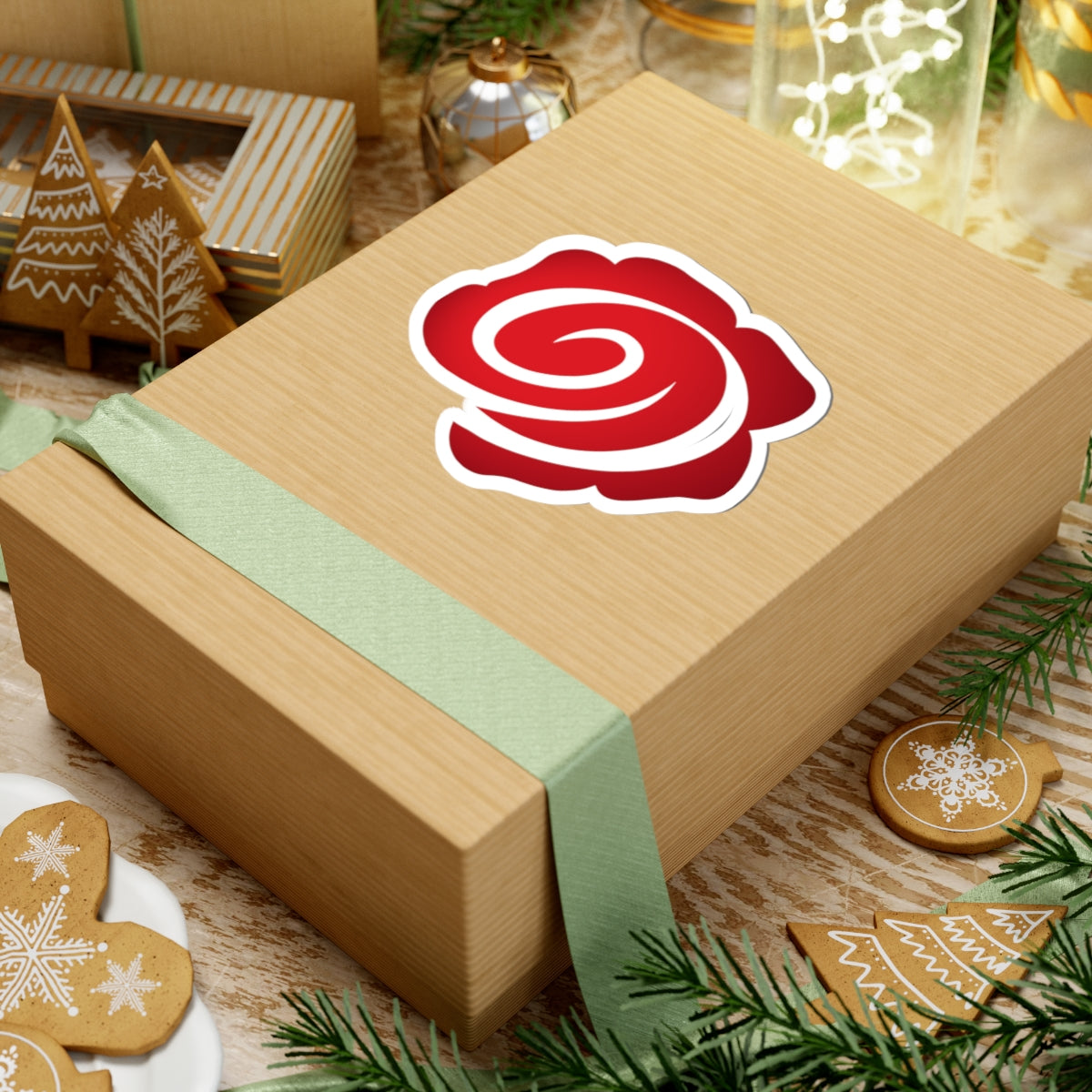 A glossy kiss-cut sticker featuring a bold, stylized red rose swirl that brings instant personality to laptops, journals, and flat surfaces.